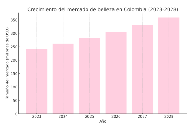 Se espera que el tamaño del mercado de belleza en Colombia crezca de 241,15 millones de dólares en 2023 a 358,28 millones de dólares en 2028, a una tasa compuesta anual del 8,24% durante el período previsto (2023-2028).